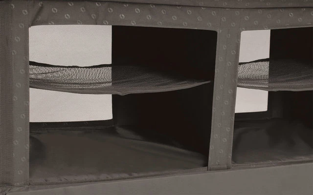 L’armadio da campeggio pieghevole Aruba in grigio con 4 scomparti e 2 scomparti in rete è ideale per riporre gli accessori da campeggio. La porta robusta e ribaltabile con maniglia offre uno spazio di stoccaggio spazioso e utilizzabile proprio come a casa. La porta è dotata di una serratura magent. Sul lato c’è anche un pratico organizer e un gancio per appendere le cose. L’armadietto da campeggio può essere usato da solo o insieme al Neat´n´Tidy Organiser. Include una borsa da trasporto per una facile conservazione e trasporto.