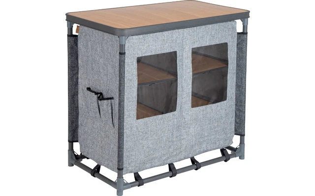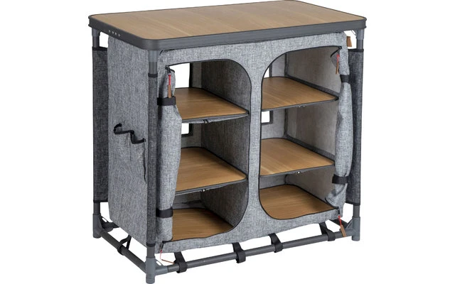 Un mobile da cucina elegante e lussuoso. Dotato di una copertura extra robusta in poliestere oxford 600D di alta qualità in look lino, che contiene 6 ripiani utili e 4 tasche laterali, così come un pannello rigido a media densità con decorazioni in legno. Le gambe sono regolabili individualmente e assicurano un’alta stabilità su qualsiasi superficie. L’armadio da cucina viene consegnato in una borsa da trasporto.