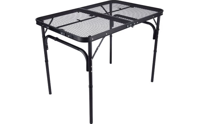 Robusto tavolo da campeggio in alluminio e peso ridotto. Questo tavolo è dotato di serie di una rete portaoggetti, che permette di metterci le riviste, per esempio. Durante il montaggio, la parte inferiore della gamba è semplicemente incastrata in posizione. Il tavolo viene consegnato con una borsa per il trasporto.