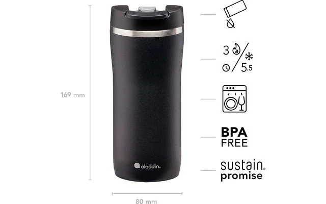 Le innovative tazze Aladdin sono dotate di un isolamento sottovuoto appositamente sviluppato, chiamato “Thermavac”, che mantiene le bevande calde fino a 4 ore e le bevande fredde fino a 6 ore.